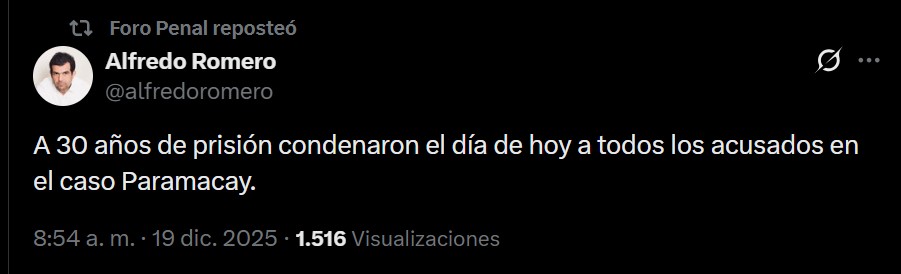 El director presidente de Foro Penal, Alfredo Romero, dijo en X que la condena ocurrió este viernes a «todos los acusados en el caso Paramacay», entre ellos los que se encontraban con medidas cautelares.