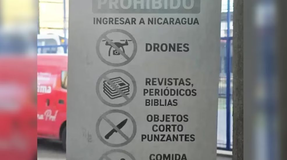 Las empresas de transporte internacional que operan rutas hacia Nicaragua advierten de forma explícita a los pasajeros sobre una lista de objetos prohibidos para ingresar al país. Entre ellos figuran libros, periódicos, revistas y Biblias. También cámaras, drones, cuchillos y alimentos perecederos.