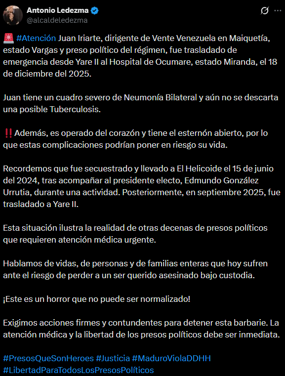 El líder opositor Antonio Ledezma alertó este lunes que el preso político Juan Iriarte, dirigente de Vente Venezuela en Maiquetía, estado La Guaira, fue hospitalizado de emergencia en el Hospital de Ocumare, estado Miranda, luego de que presentara complicaciones de salud el pasado jueves en la cárcel de Yare II.