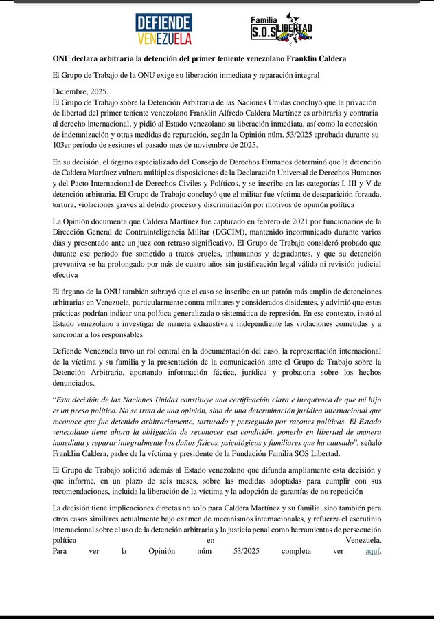 El Grupo de Trabajo sobre la Detención Arbitraria de la Organización de las Naciones Unidas (ONU) emitió la Opinión núm. 53/2025, en la cual declaró que la privación de libertad del primer teniente venezolano Franklin Alfredo Caldera Martínez es arbitraria y viola flagrantemente el derecho internacional.
