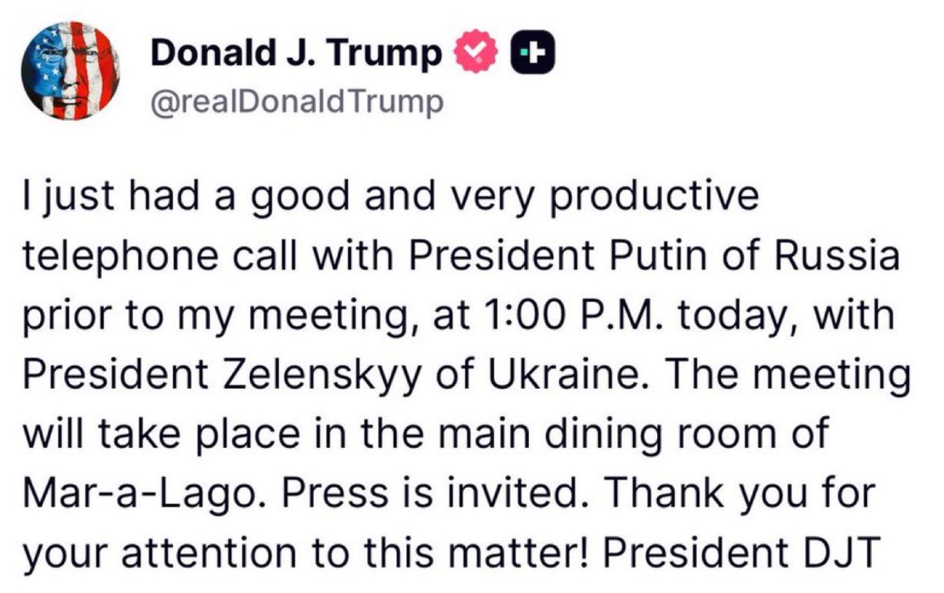 «Acabo de tener una conversación telefónica muy productiva con el presidente Putin de Rusia antes de mi reunión, hoy a la 1:00 p. m., con el presidente Zelenski de Ucrania», indicó Trump en su red TruthSocial donde suele hacer anuncios.
