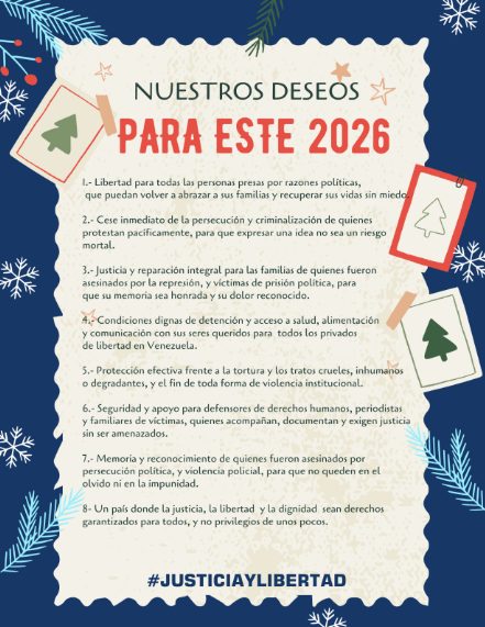 En el marco de las festividades decembrinas y el cierre del año 2025, la organización no gubernamental Justicia, Encuentro y Perdón (JEP) emitió un comunicado a través de su cuenta en X, haciendo un llamado por el respeto a los derechos humanos y la liberación de los presos políticos en Venezuela.