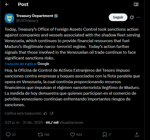 “No permitiremos que el régimen ilegítimo de Maduro se beneficie de la exportación de petróleo mientras inunda Estados Unidos con drogas letales”, declaró el secretario del Tesoro, Scott Bessent.