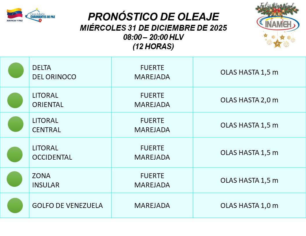 Litoral Central, Occidental, Zona Insular y Delta del Orinoco: Olas de hasta 1,5 metros.