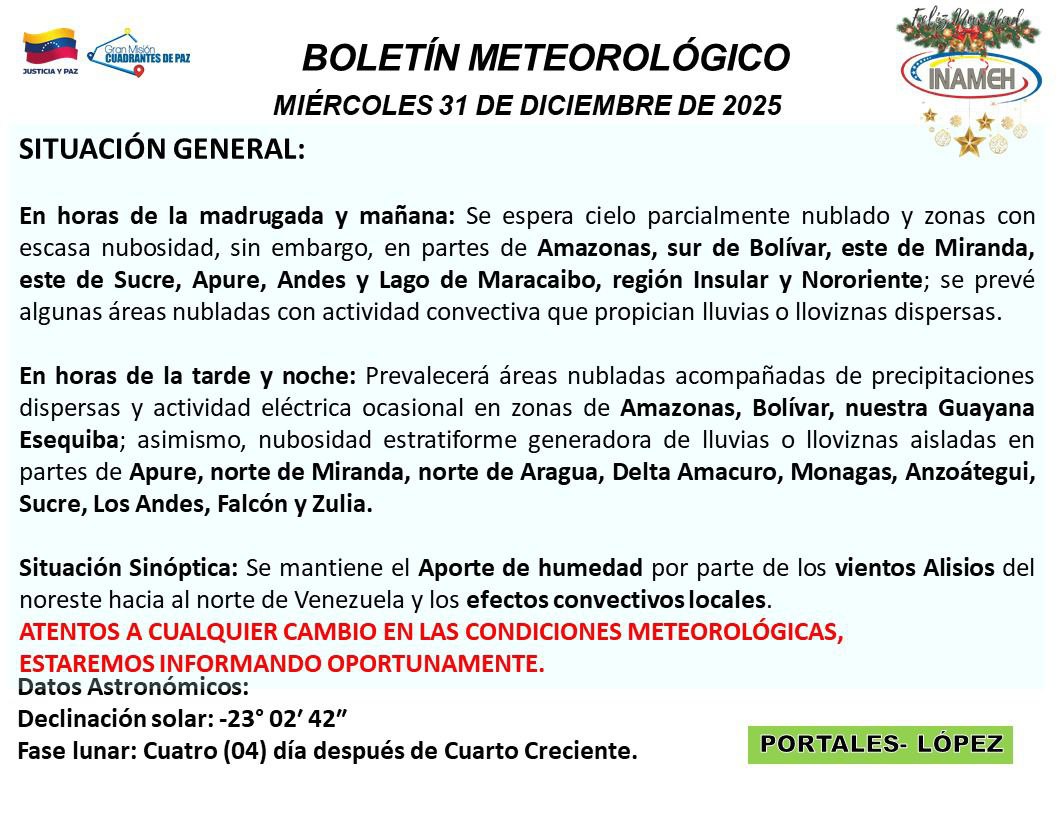 Este miércoles 31 de diciembre, el Instituto Nacional de Meteorología e Hidrología (Inameh) reporta condiciones climáticas mayormente estables en el territorio nacional, aunque con variaciones importantes para la tarde y noche.