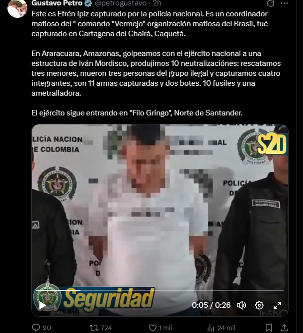 A través de su cuenta oficial en la red social X (antes Twitter), el mandatario informó que la Policía Nacional capturó a Efrén Ipiz, señalado como coordinador mafioso del “Comando Vermelho”, en el municipio de Cartagena del Chairá, departamento de Caquetá.