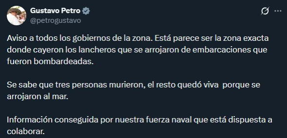 «Aviso a todos los gobiernos de la zona. Esta parece ser la zona exacta donde cayeron los lancheros que se arrojaron de embarcaciones que fueron bombardeadas. Se sabe que tres personas murieron, el resto quedó viva porque se arrojaron al mar», expresó el mandatario en X, donde publicó el mapa del punto -cercano a México y Guatemala- donde supuestamente fue lanzado el ataque de EEUU.