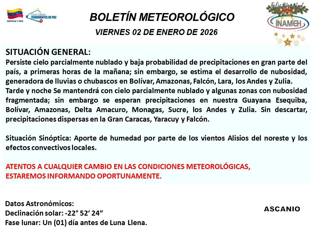 El Instituto Nacional de Meteorología e Hidrología (Inameh) informó que para la mañana de este viernes 2 de enero de 2026, persiste el predominio de cielo parcialmente nublado y baja probabilidad de precipitaciones en gran parte del territorio nacional.
