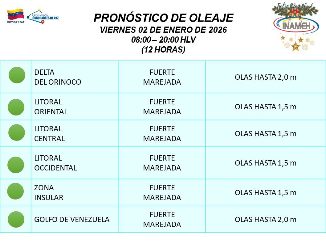 Delta del Orinoco y Golfo de Venezuela: Olas de hasta 2,0 metros.