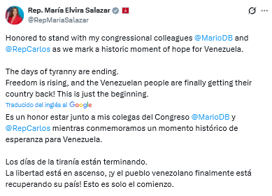 A través de su cuenta en X, la representante de Florida subrayó la importancia de la unidad legislativa en este proceso. Salazar se mostró junto a otros líderes cubanoamericanos que han mantenido una postura firme contra el régimen chavista.