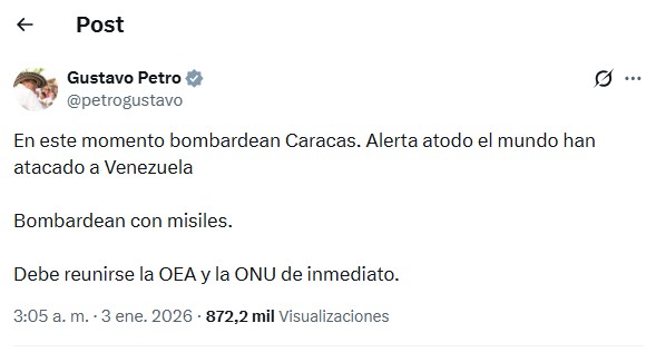 «En este momento bombardean Caracas. Alerta a todo el mundo han atacado a Venezuela. Bombardean con misiles», manifestó Petro en su cuenta de X en la que pidió reuniones de urgencia de la Organización de Estados Americanos (OEA) y de la ONU. EFE