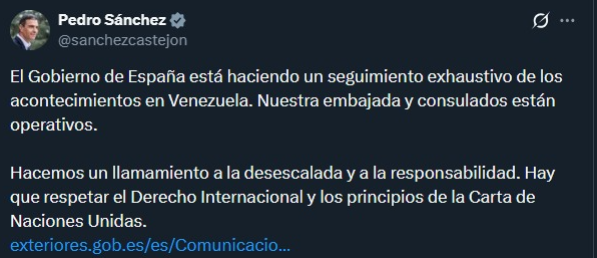 En una publicación realizada en su cuenta de X, Sánchez aseguró que el Gobierno de España está haciendo «un seguimiento exhaustivo de los acontecimientos en Venezuela» y ha detallado que tanto la embajada como los consulados están operativos, mientras el Ministerio de Exteriores español está pendiente de la situación de la colonia en el país.