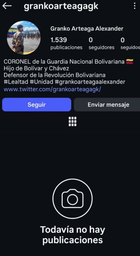 La antigua cuenta en Instagram de Granko Artega dejó de estar visible este domingo. Previamente, el coronel sancionado por Estados Unidos y la Unión Europea (UE) había eliminado todas sus publicaciones.