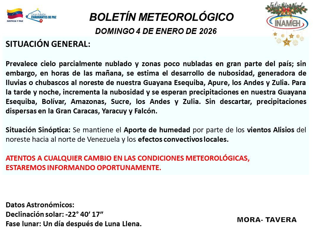 Este 4 de enero, el Instituto Nacional de Meteorología e Hidrología (Inameh) reportó de nubosidad variable y precipitaciones en diversas regiones de Venezuela, acompañadas de condiciones marítimas estables.