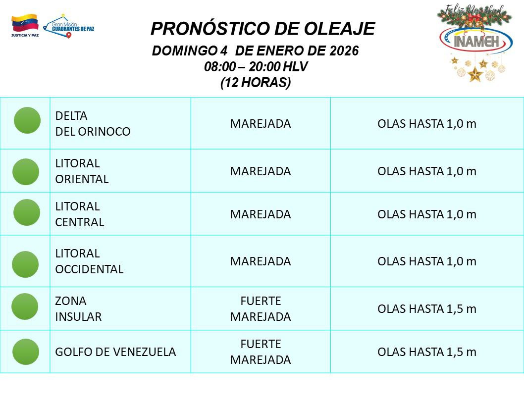 En cuanto al estado de las costas venezolanas, se reporta una situación de normalidad con olas que van desde 1 a 1,5 metros de altura.