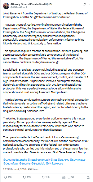 En un comunicado conjunto emitido este domingo 4 de enero, el Departamento de Justicia (DOJ), el Buró Federal de Investigaciones (FBI) y la Administración para el Control de Drogas (DEA) oficializaron el éxito de la «compleja misión de aplicación de la ley» que puso a Nicolás Maduro bajo custodia estadounidense.