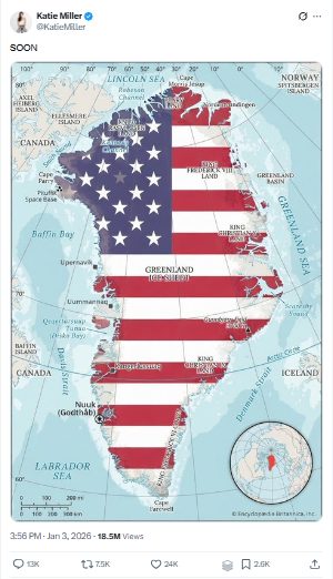 La mujer del ultranacionalista asesor de la Casa Blanca Stephen Miller ha desatado un roce diplomático con Dinamarca al publicar en su cuenta de X un mapa de Groenlandia, territorio convertido en la ambición del presidente norteamericano, Donald Trump, con un mensaje amenazador: «Pronto» y bajo la bandera estadounidense.