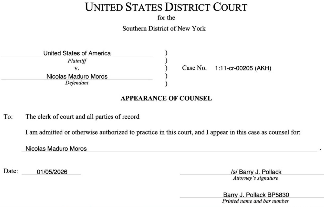 Nicolás Maduro ha formalizado su defensa legal ante el Tribunal Federal del Distrito Sur de Nueva York. El abogado penalista Barry Pollack presentó hoy ante la corte el documento de «appearance of counsel», el paso procesal que acredita oficialmente que asume la representación del exmandatario venezolano en la causa penal federal que enfrenta desde 2011.