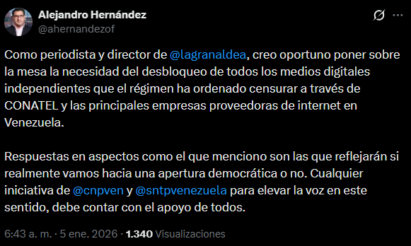 «Como periodista y director de La Gran Aldea, creo oportuno poner sobre la mesa la necesidad del desbloqueo de todos los medios digitales independientes que el régimen ha ordenado censurar a través de CONATEL y las principales empresas proveedoras de internet en Venezuela», se pronunció Alejandro Hernández en redes sociales.