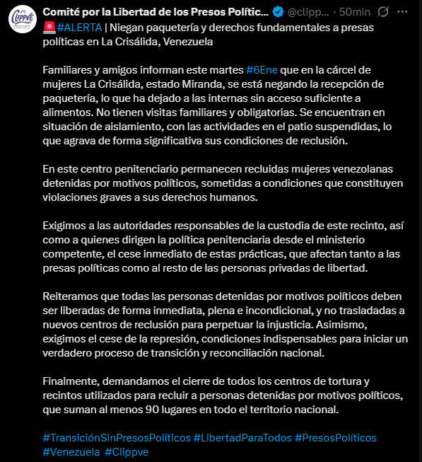 El comité subrayó que en La Crisálida permanecen recluidas mujeres venezolanas detenidas por razones políticas, sometidas a condiciones que constituyen violaciones graves a los derechos humanos, contrarias a la legislación nacional y a los tratados internacionales suscritos por Venezuela.