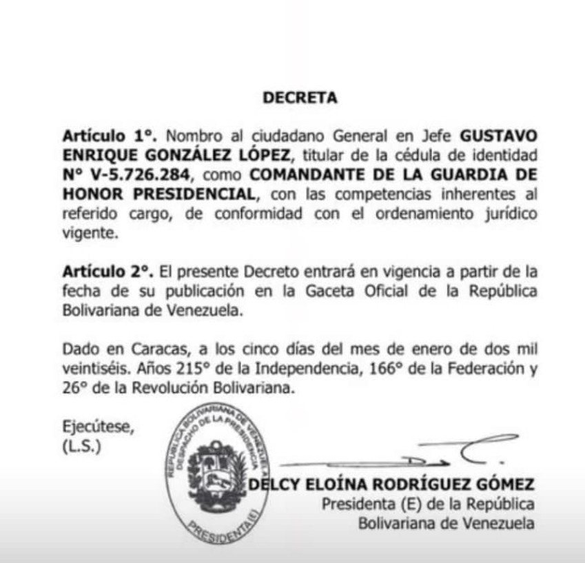 La presidenta (E) de la República Bolivariana de Venezuela, Delcy Rodríguez, nombra a Gustavo Enrique González López como el nuevo comandante de la Guardia de Honor Presidencial.
