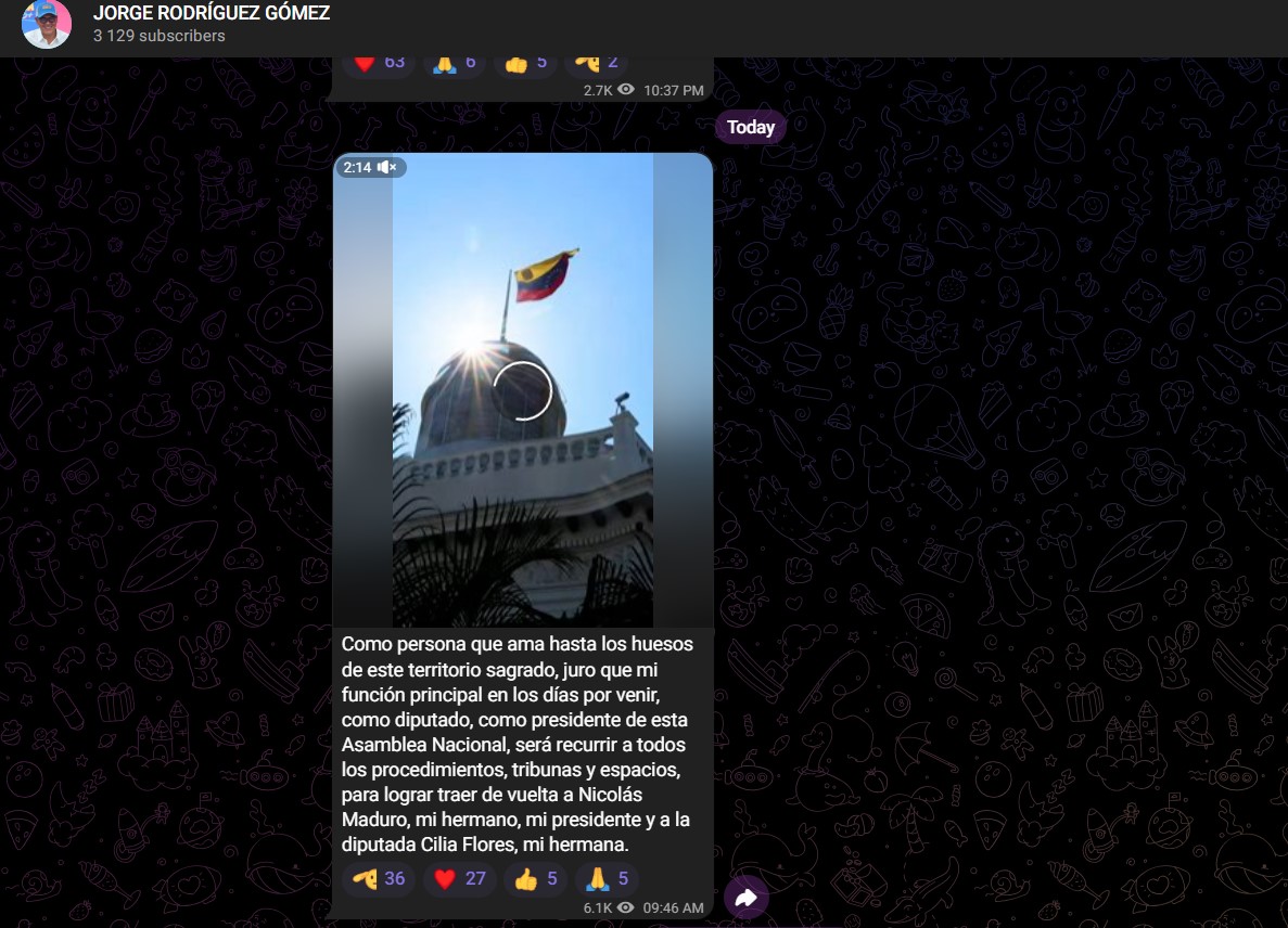 El pronunciamiento lo hizo a través de su canal de Telegram, donde Rodríguez afirmó que, en su condición de diputado y jefe del Parlamento, recurrirá a procedimientos, tribunas y escenarios políticos para gestionar lo que calificó como el retorno de “su hermano” y “su presidente”.