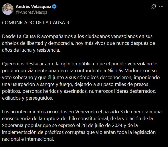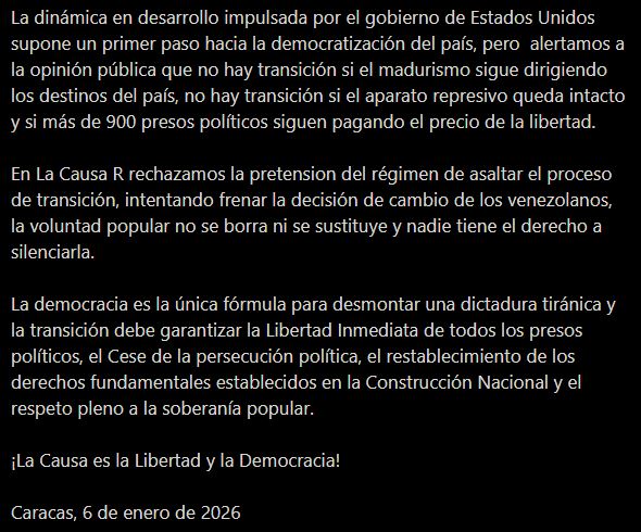 «En La Causa R rechazamos la pretensión del régimen de asaltar el proceso de transición, intentando frenar la decisión de cambio de los venezolanos, la voluntad popular no se borra ni se sustituye y nadie tiene el derecho a silenciarla», manifestó la formación política en un comunicado compartido en X por el dirigente Andrés Velásquez.