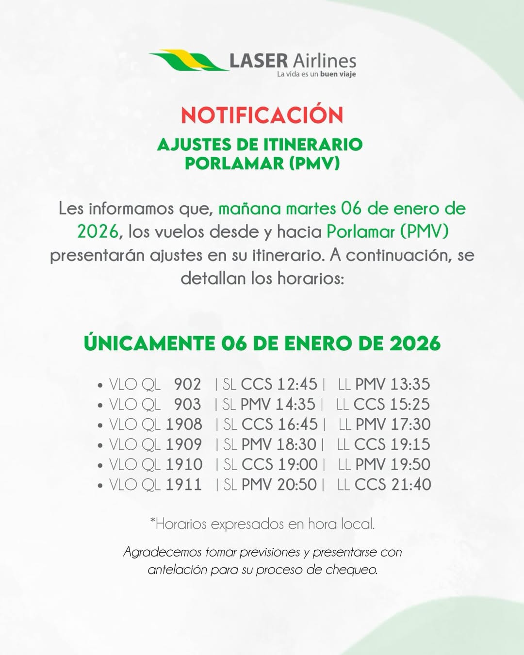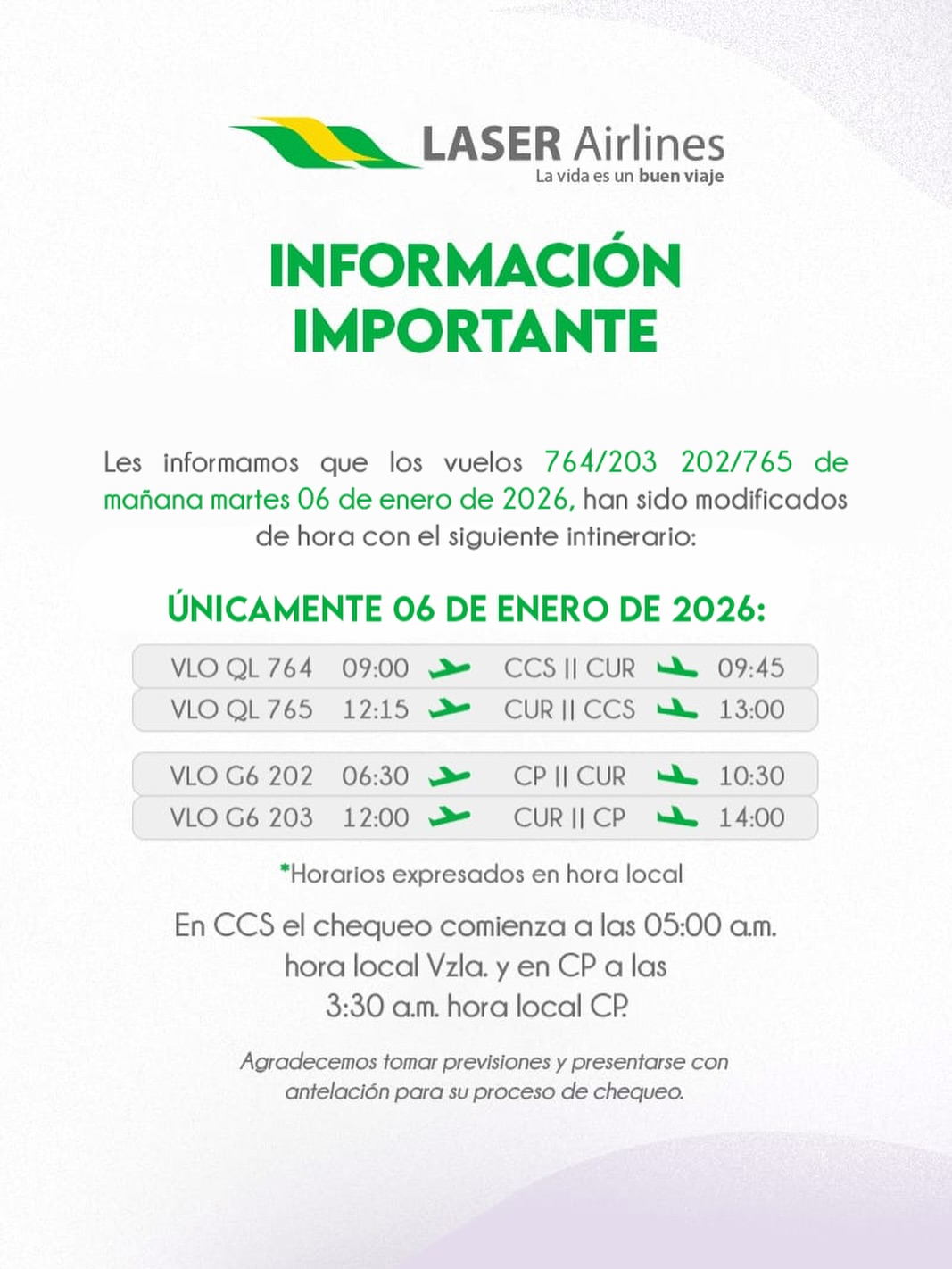 La aerolínea venezolana Laser Airlines anunció a través de sus redes sociales ajustes en sus itinerarios de vuelos previstos para este martes 6 de enero.