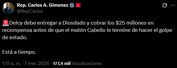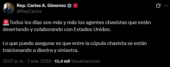 El congresista Carlos Giménez se pronunció este miércoles en redes sociales sobre las presuntas disputas internas en el Palacio de Miraflores luego de la caída de Nicolás Maduro, capturado por Estados Unidos, y la abrupta designación de Delcy Rodríguez en su lugar.