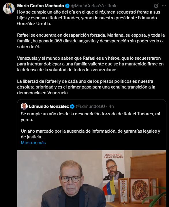 La líder venezolana de las fuerzas democráticas y ganadora del Premio Nobel de la Paz, María Corina Machado, publicó un mensaje este miércoles 7 de enero en su cuenta oficial de X, en el que se conmemora el primer aniversario del secuestro y desaparición forzada de Rafael Tudares, yerno de Edmundo González Urrutia, presidente electo.