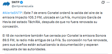 El Sindicato Nacional de Trabajadores de la Prensa (Sntp) denunció que la Comisión Nacional de Telecomunicaciones (Conatel) ordenó el cese de transmisiones de la emisora Impacto 105.3 FM, ubicada en La Fría, municipio García de Hevia del estado Táchira.
