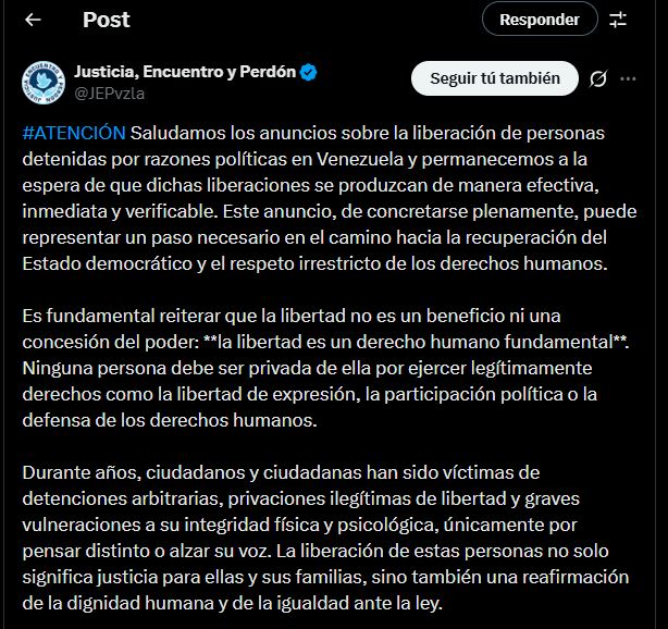 En su comunicado, Justicia, Encuentro y Perdón destacó que “saludamos los anuncios sobre la liberación de personas detenidas por razones políticas en Venezuela y permanecemos a la espera de que dichas liberaciones se produzcan de manera efectiva, inmediata y verificable”.