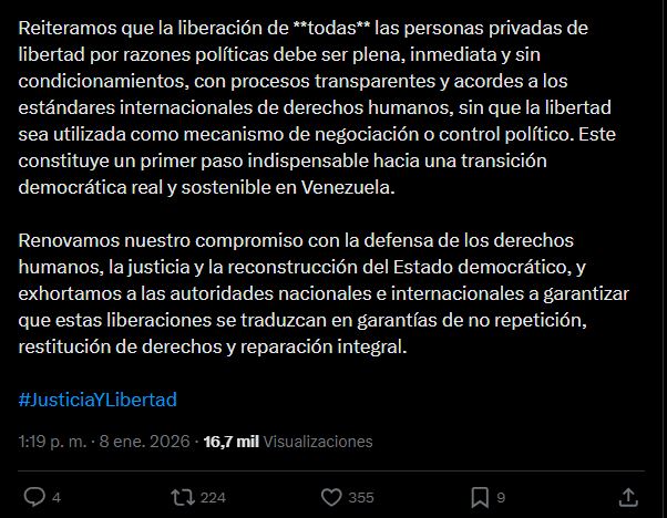 Rechaza el uso de la libertad como mecanismo de negociación o control político, y sostiene que solo así se podrá avanzar hacia una transición democrática real y sostenible en Venezuela.