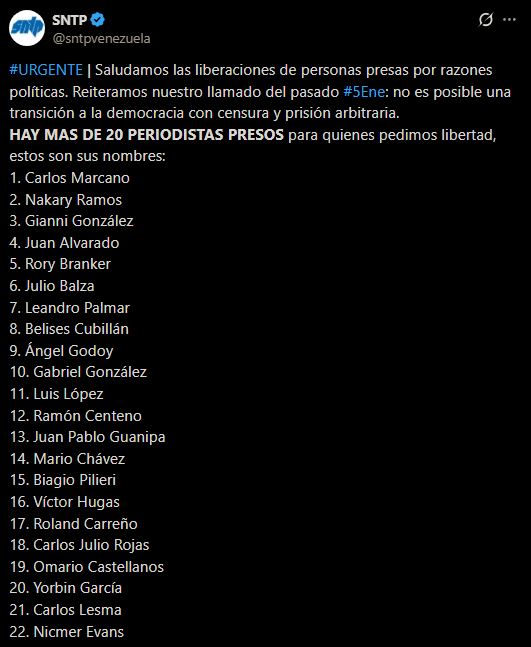 A través de una publicación en su cuenta de X, el Sntp saludó las liberación de varios presos políticos, pero recordó que decenas de reporteros están tras las rejas sin que se les haya dado acceso a un debido proceso judicial.