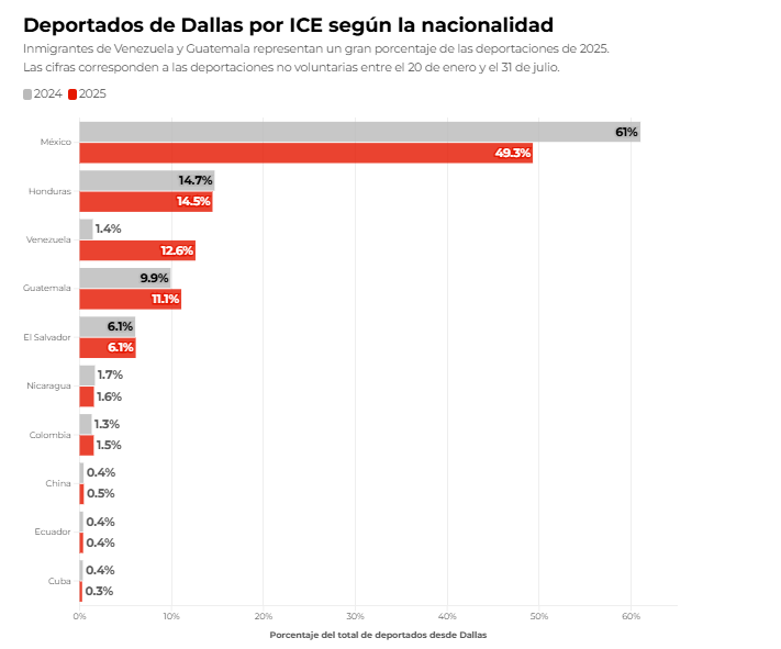 Un análisis de The Dallas Morning News de la información de arrestos y deportaciones obtenidos a través de una demanda por el Deportation Data Project (Proyecto de Datos de Deportación) muestra que, en el área de Dallas bajo la responsabilidad de ICE, los arrestos de venezolanos se incrementaron más de 400% en 2025, comparados con los de 2024.