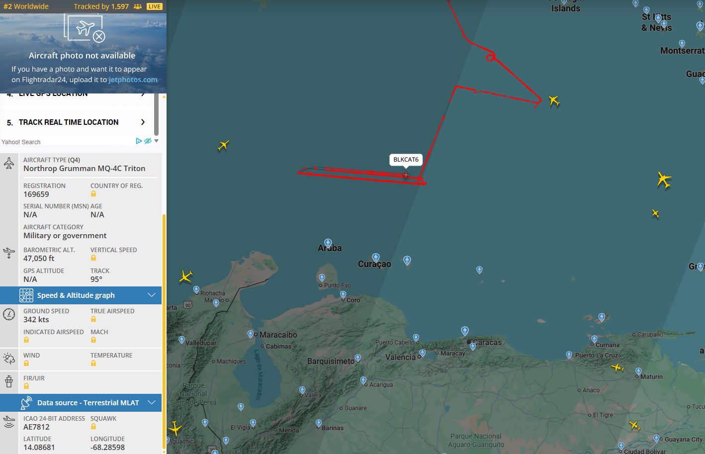 Según datos del monitor digital FlightRadar24, el dron furtivo no artillado despegó desde la Estación Aeronaval de Jacksonville, en Florida, y durante horas ha sostenido su visita en el mar Caribe, entre las zonas de reconocimiento de vuelo (FIR, por sus siglas en inglés) de Curazao y Venezuela.
