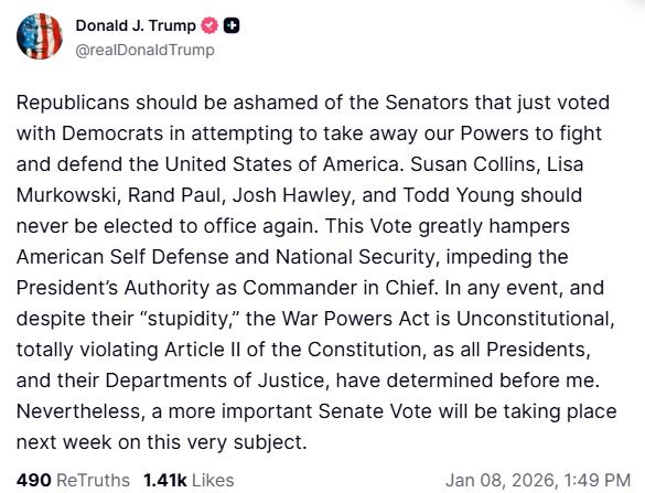 En su defensa, Trump calificó la Ley de Poderes de Guerra como «inconstitucional» y una violación del Artículo II, argumentando que la votación «obstaculiza enormemente la autodefensa estadounidense» y socava su autoridad como Comandante en Jefe. Finalmente, advirtió que la próxima semana se llevará a cabo una «votación más importante» sobre este mismo asunto.