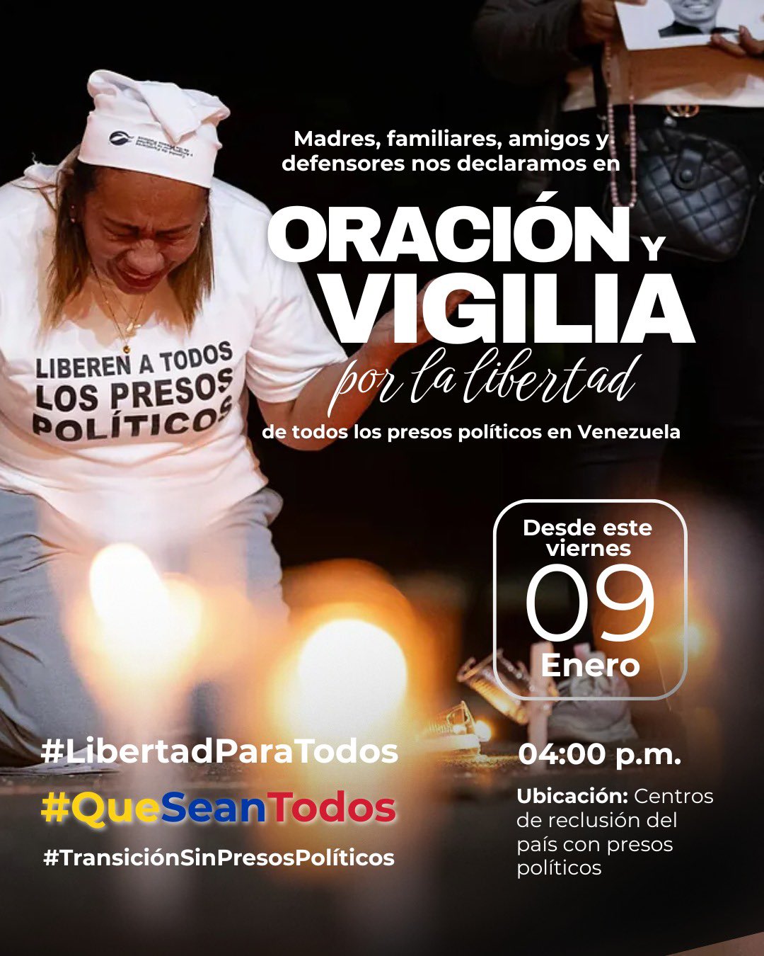 El Comité por la Libertad de los Presos Políticos (Clippve) convocó de manera urgente a vigilias y oraciones en los centros de reclusión del país, ante la incertidumbre generada por la ausencia de excarcelaciones masivas de presos políticos, tal como fue anunciado por Jorge Rodríguez desde la Asamblea Nacional la tarde del jueves 8 de enero.