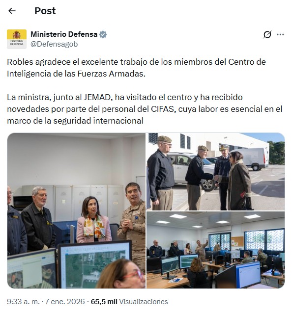 La ministra de Defensa, Margarita Robles, visitó el pasado miércoles el cuartel general del Centro de Inteligencia de las Fuerzas Armadas (CIFAS), el servicio de espionaje militar español. Allí, acompañada del Jefe del Estado Mayor de la Defensa, pudo conocer de primera mano el trabajo de los especialistas en esta materia. Su departamento publicó posteriormente unas imágenes de su visita en las que puede verse la información que estaba consultando el personal en sus ordenadores. En uno de ellos aparece un mapa de Fuerte Tiuna, el complejo militar del Ejército chavista en el que Estados Unidos capturó el pasado sábado a Nicolás Maduro. Es también donde reside -o residía hasta ahora- Delcy Rodríguez, actual presidenta venezolana, en una instalación con búnker denominada La Viñeta.