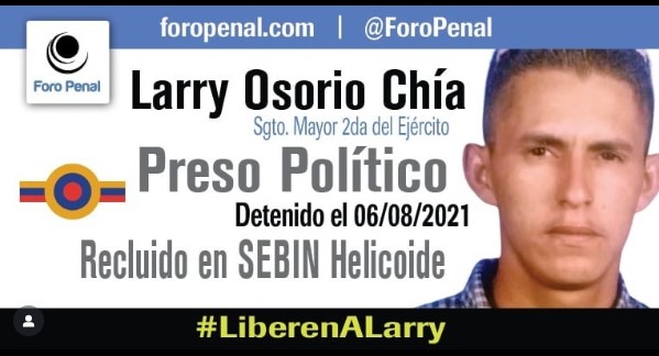 La ONG Foro Penal informó la madrugada de este viernes 9 de enero sobre la excarcelación de Larry Osorio Chía, quien permanecía detenido desde el 6 de agosto de 2021 por razones políticas, según anunció en su cuenta de X el vicepresidente de la organización, Gonzalo Himiob.