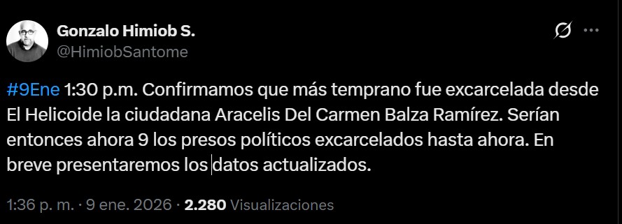 “Confirmamos que más temprano fue excarcelada desde El Helicoide la ciudadana Aracelis Del Carmen Balza Ramírez. Serían entonces ahora 9 los presos políticos excarcelados hasta ahora», precisó Himiob en un mensaje publicado en su cuenta de X.