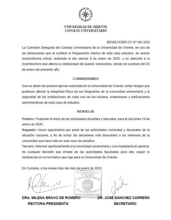 El Consejo Universitario de la Universidad de Oriente publicó este viernes un comunicado donde establece que el inicio de las actividades educativas en sus diferentes núcleos será el próximo 19 de enero.