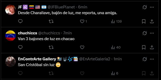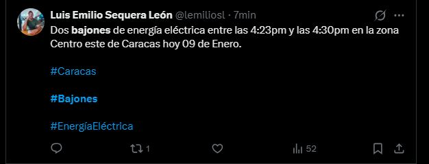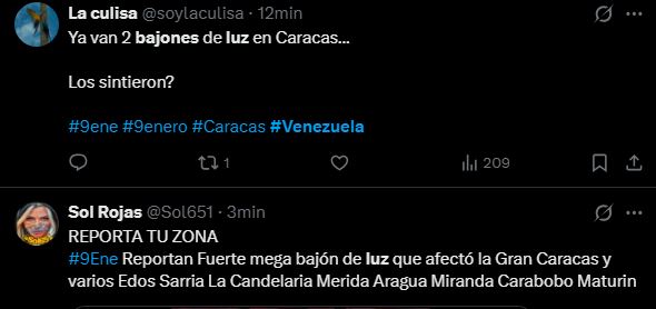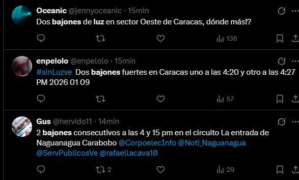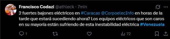 Otro testimonio de @soylaculisa mencionó dos bajones en Caracas, preguntando si otros también lo sufrió. Además, @athleck, indicó fuertes bajones eléctricos en Caracas, afectando equipos electrónicos en la mayoría de las zonas.