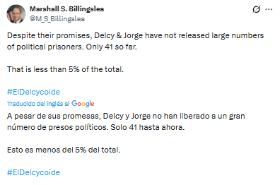 «A pesar de sus promesas, Delcy y Jorge no han liberado a un gran número de presos políticos. Solo 41 hasta ahora. Esto es menos del 5% del total», sentenció Billingslea.