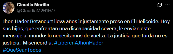 «Jhon Hader Betancurt lleva años injustamente preso en El Helicoide. Hoy sus hijos, que enfrentan una discapacidad severa, le envían este mensaje al mundo: lo necesitamos de vuelta», expresó su esposa, Claudia Morillo, en redes sociales.