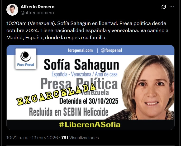 El director presidente de Foro Penal, Alfredo Romero, informó a través de su cuenta en X que Sofía Sahagún fue puesta en libertad a las 10:20 de la mañana (hora de Venezuela). Sahagún permanecía detenida desde octubre de 2024 y posee nacionalidad española y venezolana.