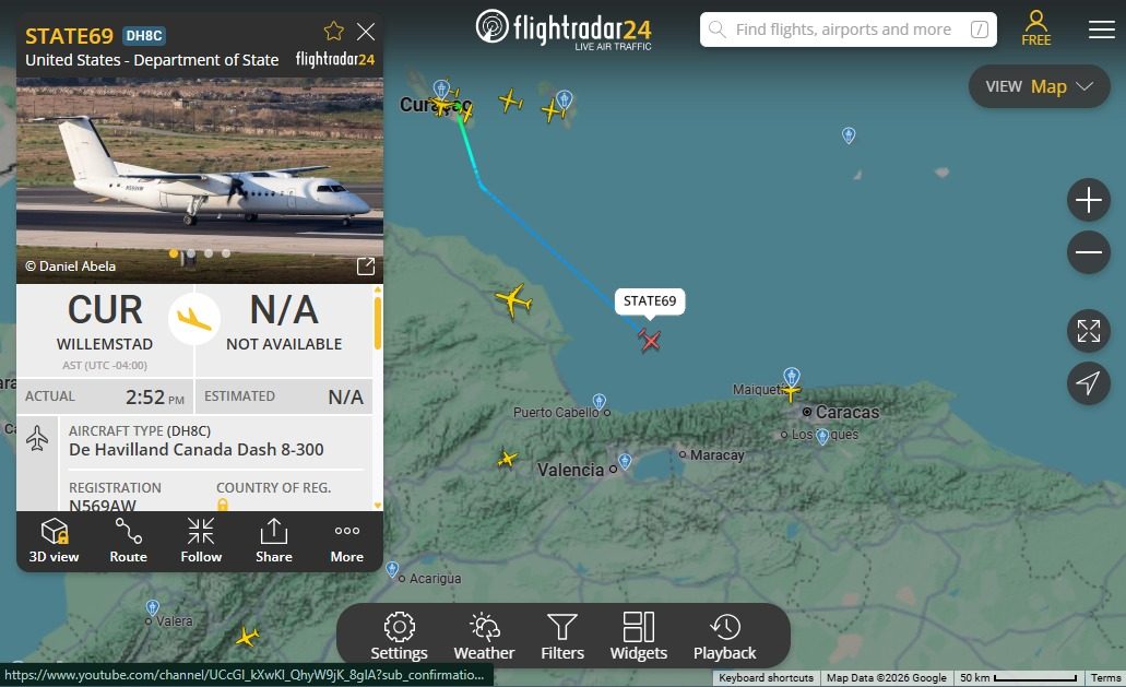 La aeronave, un De Havilland Canada Dash 8-300 registrado con la matrícula N569AW, completó la ruta desde Willemstad, Curazao, según confirmación del sitio de rastreo aéreo FlightRadar24.