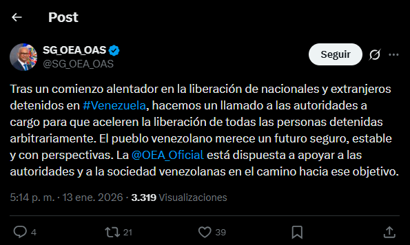 La OEA, organismo regional con mandato para promover la democracia, los derechos humanos y la seguridad, ha mantenido en las últimas semanas un enfoque crítico sobre la situación de los detenidos en Venezuela, en medio de informes que señalan que, aunque algunas personas han sido liberadas, cientos siguen en prisión por motivos políticos o arbitrarios según organizaciones internacionales de derechos humanos.
