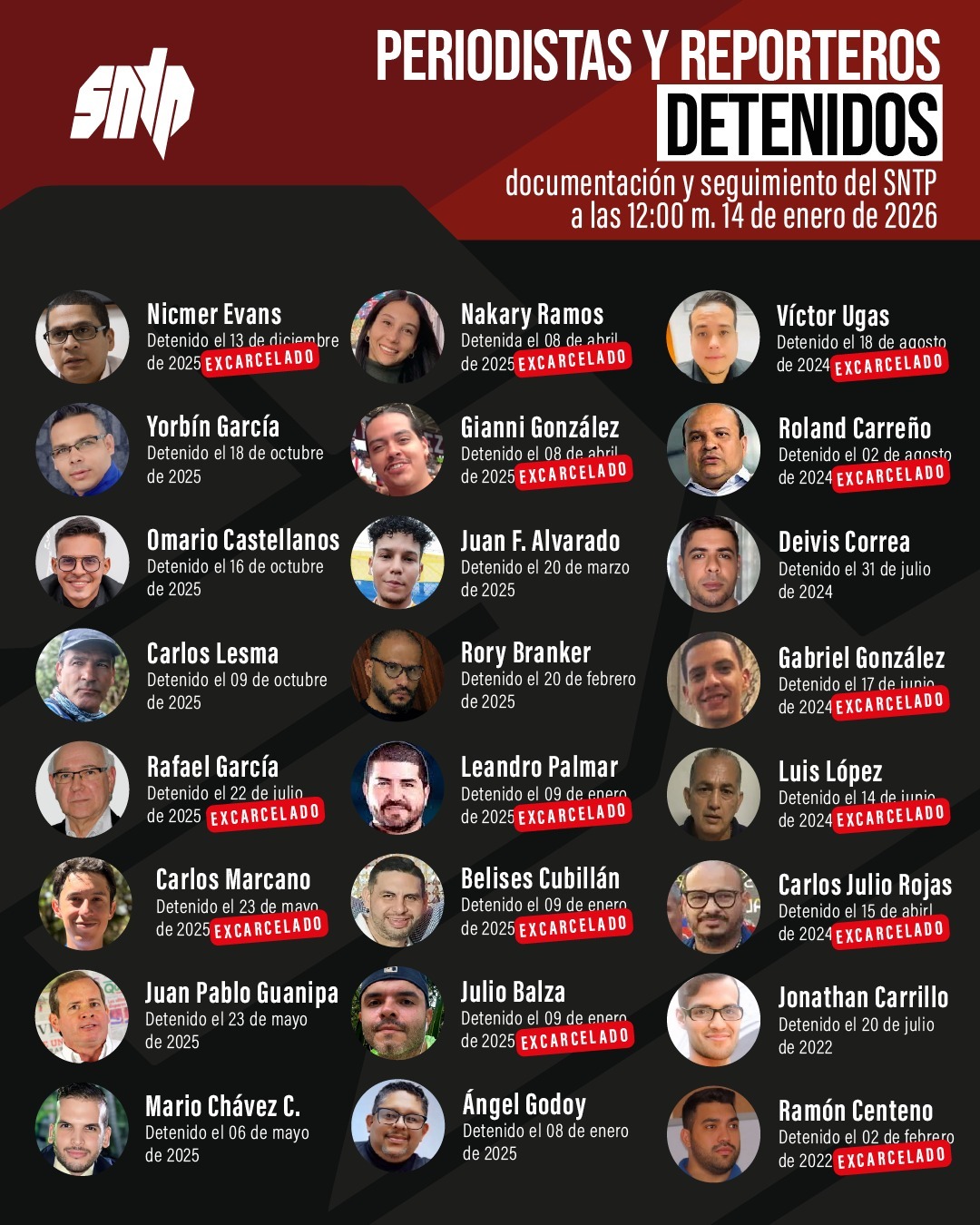 El Sindicato Nacional de Trabajadores de la Prensa (SNTP) informó que, hasta las 12:00 del mediodía de este martes 14 de enero, se ha logrado confirmar la excarcelación de 18 periodistas y trabajadores de la prensa que permanecían detenidos arbitrariamente por el régimen chavista.