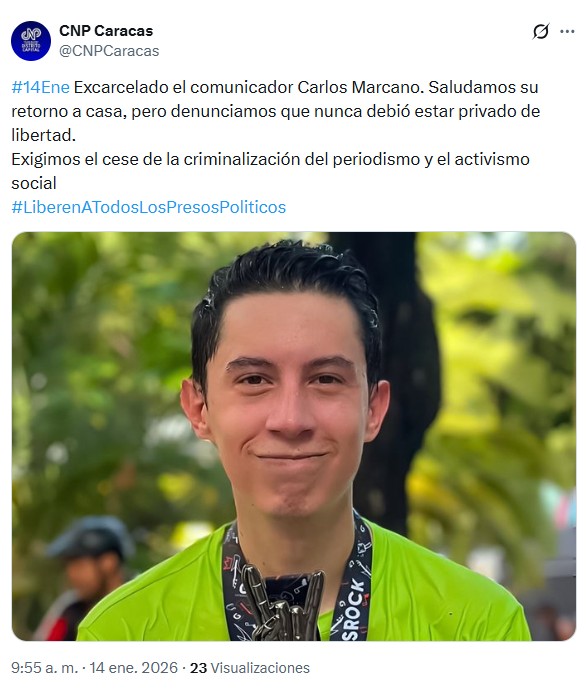 El Colegio Nacional de Periodistas (CNP) Seccional Caracas informó sobre la excarcelación del comunicador Carlos Marcano, quien se encontraba en la cárcel de Tocorón, en el estado Aragua, uno de los principales penales del país.